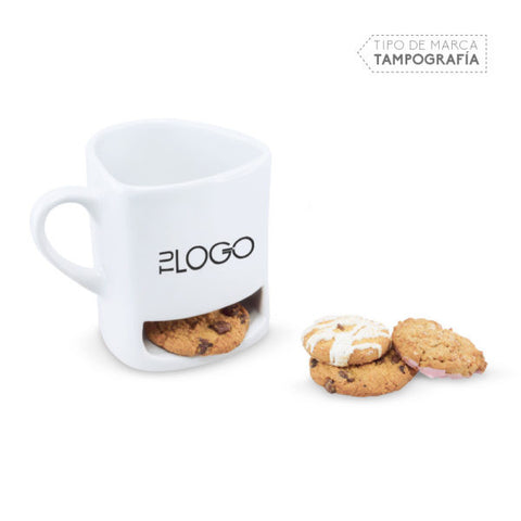 • Mug en cerámica con compartimiento en la base para acompañamientos (galletas, dulce, té, etc) o elementos (esferos, tarjetas, clips, stickies etc.).
